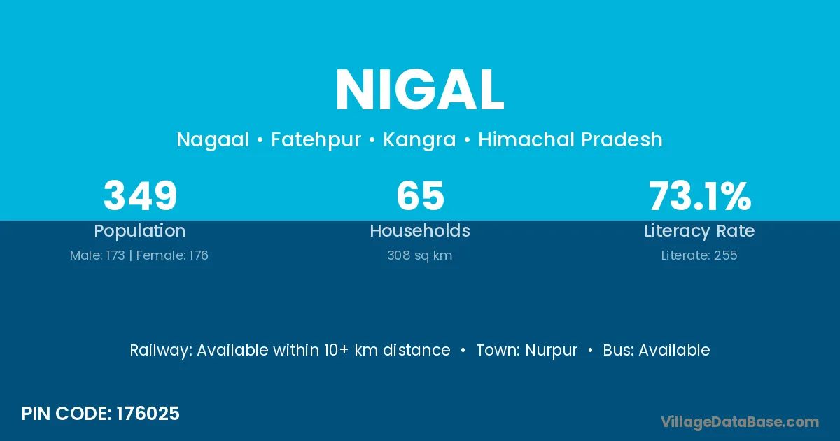 Nigal village has a total population of 349 people, of which 173 are males and 176 are females.