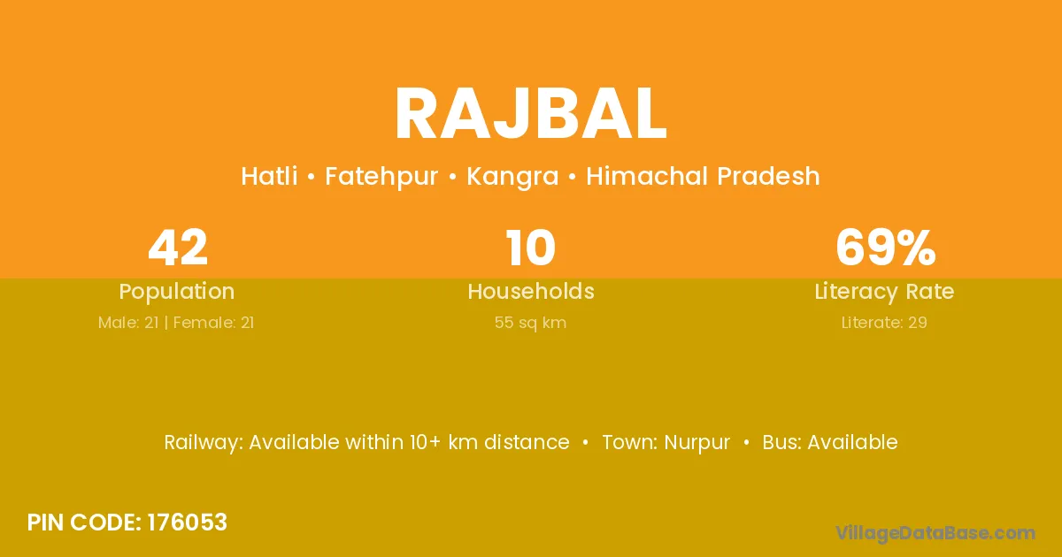 Rajbal village has a total population of 42 people, of which 21 are males and 21 are females.