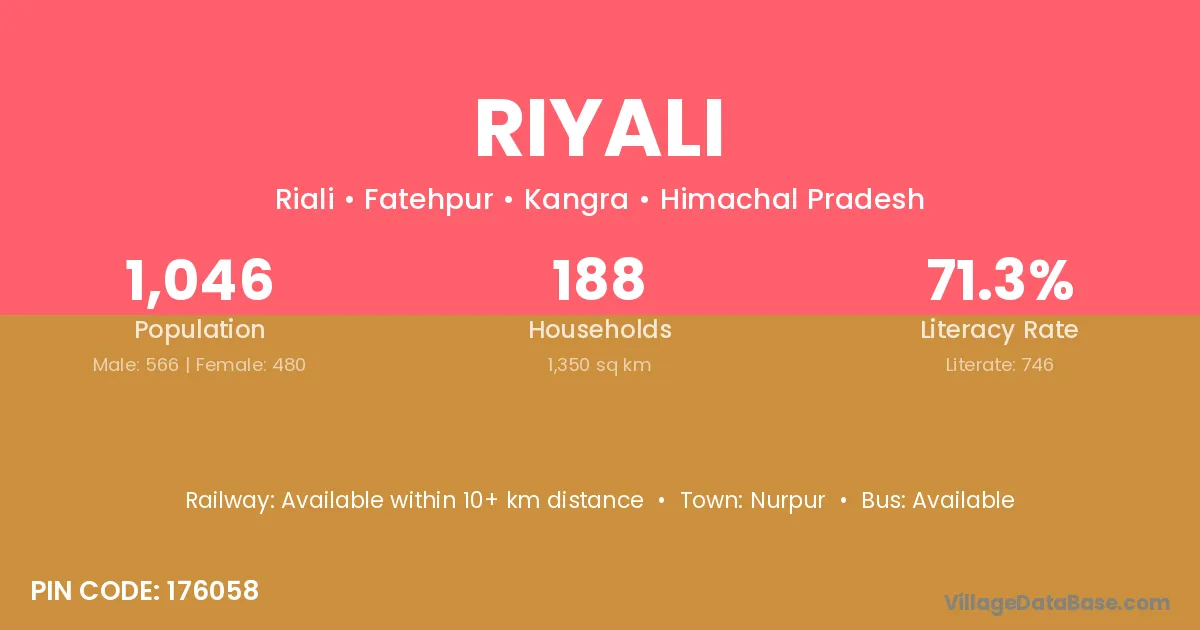 Riyali village has a total population of 1,046 people, of which 566 are males and 480 are females.
