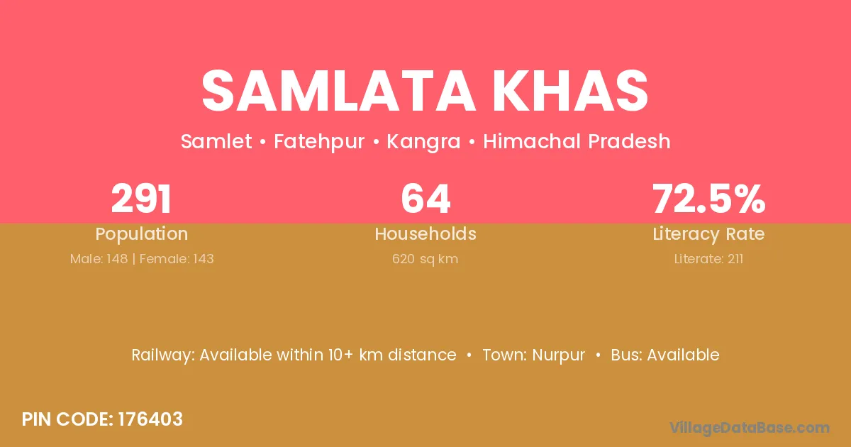 Samlata Khas village has a total population of 291 people, of which 148 are males and 143 are females.
