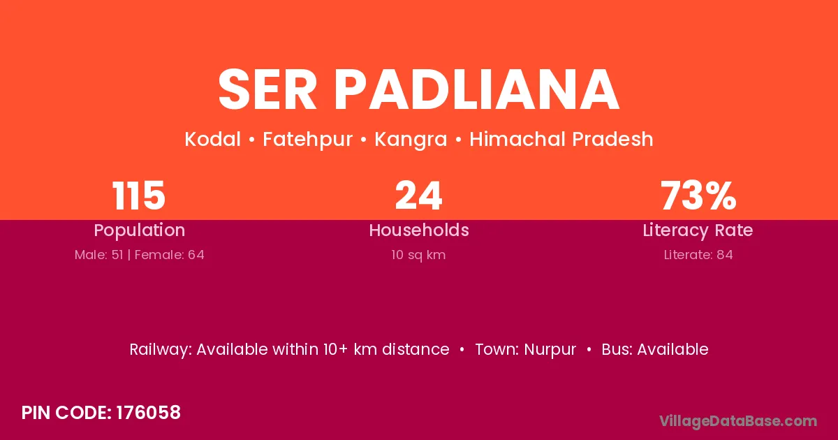 Ser Padliana village has a total population of 115 people, of which 51 are males and 64 are females.