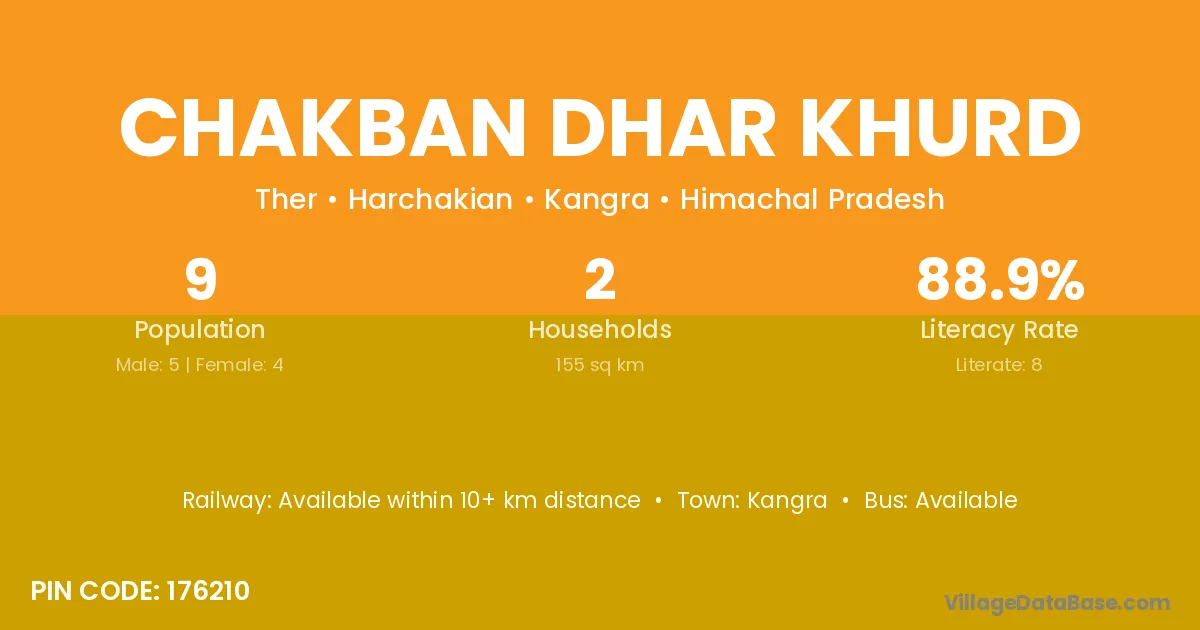 Chakban Dhar Khurd village has a total population of 9 people, of which 5 are males and 4 are females.
