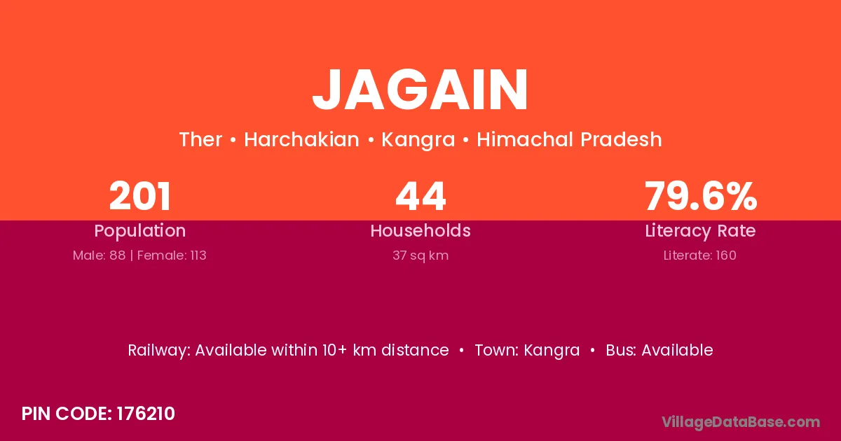 Jagain village has a total population of 201 people, of which 88 are males and 113 are females.