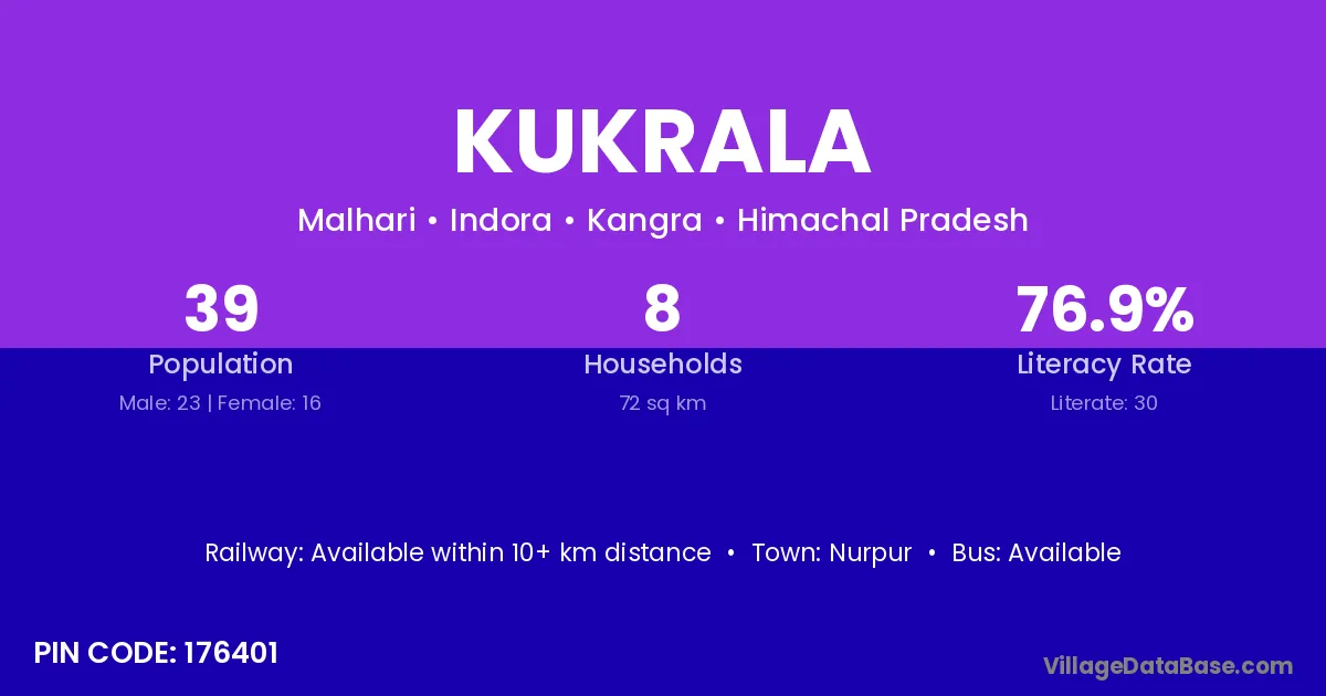 Kukrala village has a total population of 39 people, of which 23 are males and 16 are females.