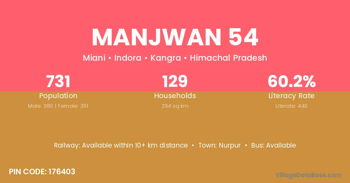 Manjwan 54 village has a total population of 731 people, of which 380 are males and 351 are females.