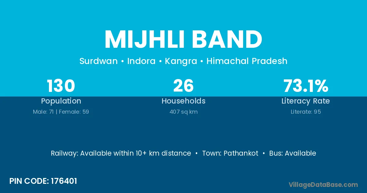Mijhli Band village has a total population of 130 people, of which 71 are males and 59 are females.