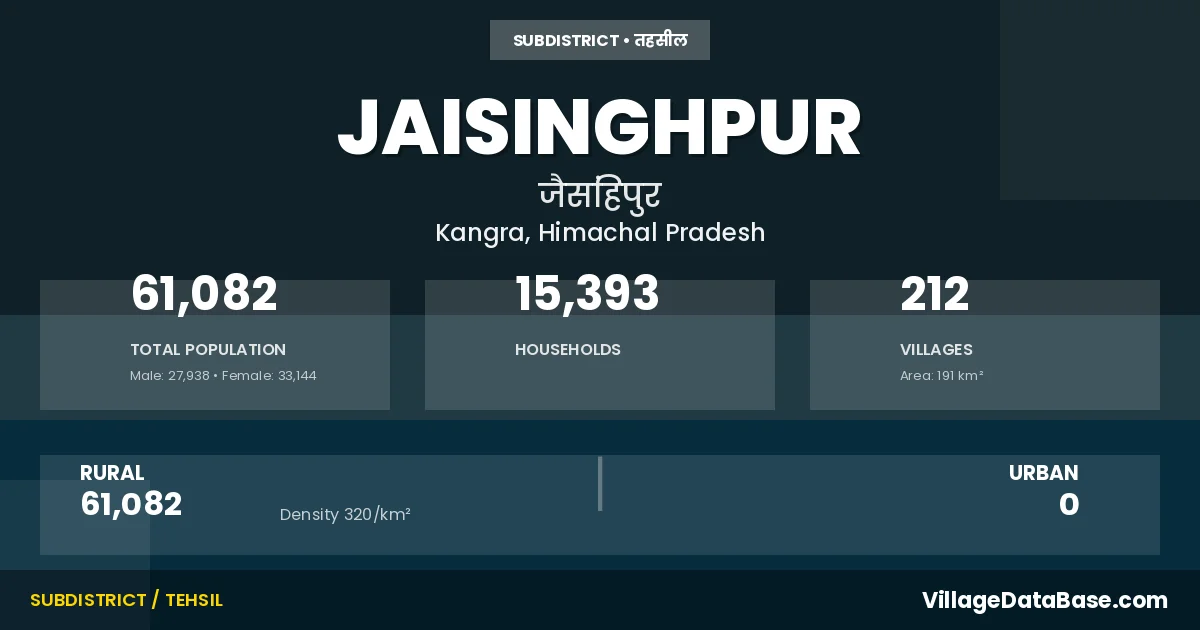 Jaisinghpur is a town and Tehsil in the Kangra district of the Himachal Pradesh. In India, a Tehsil is a subdivision of a district responsible for the administration and revenue collection of a specific area within the district. Tehsils play a crucial role in the local governance structure, contributing significantly to the development and administration of their communities.