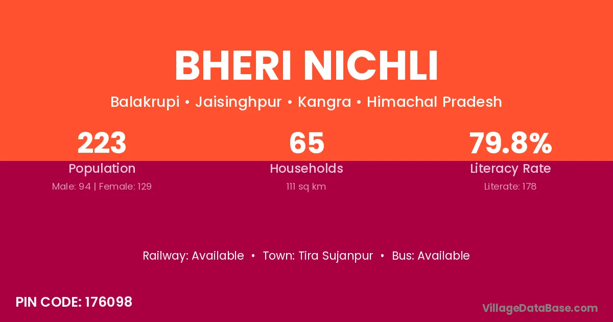 Bheri Nichli village has a total population of 223 people, of which 94 are males and 129 are females.