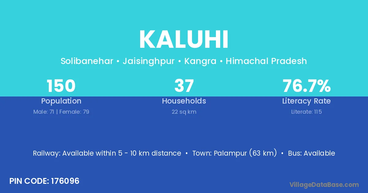 Palampur (63 km) is the nearest town to Kaluhi village for major economic activities and is located approximately 63 km away.
