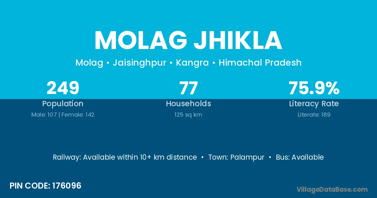 Palampur is the nearest town to Molag Jhikla village for major economic activities