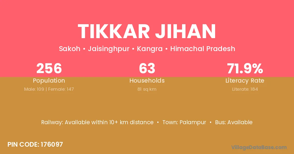Palampur is the nearest town to Tikkar Jihan village for major economic activities