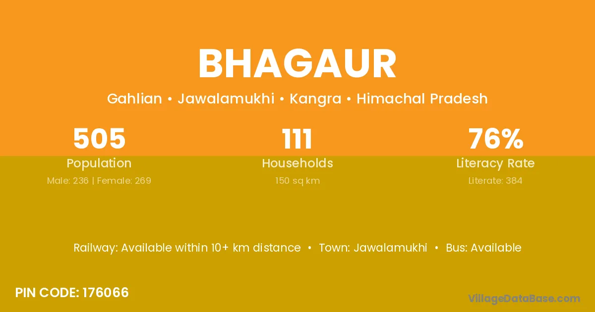 Jawalamukhi is the nearest town to Bhagaur village for major economic activities