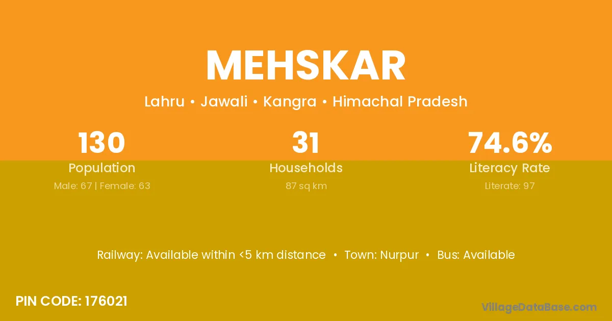 Mehskar village has a total population of 130 people, of which 67 are males and 63 are females.