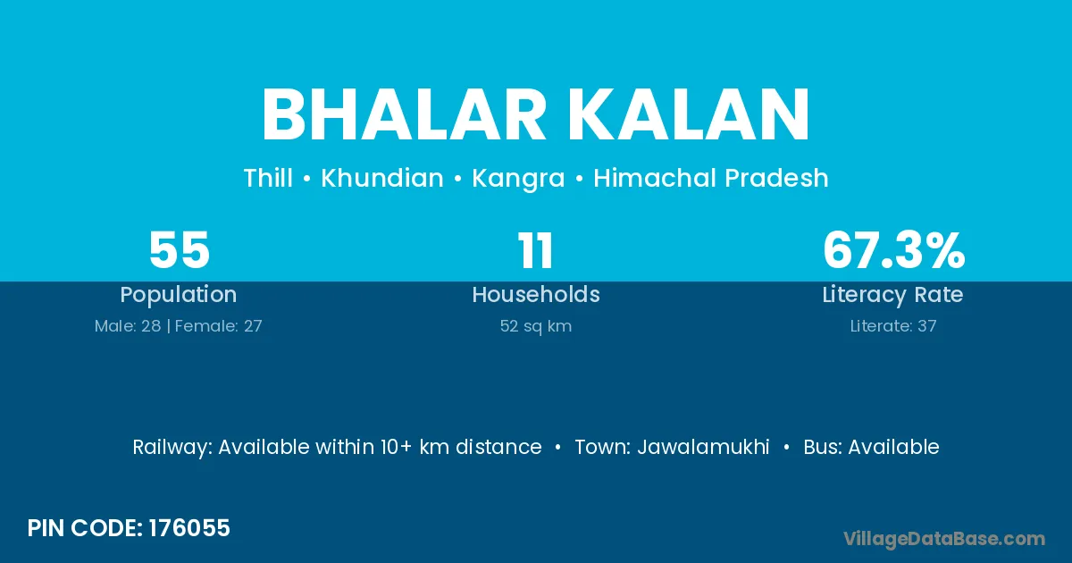 Bhalar Kalan village has a total population of 55 people, of which 28 are males and 27 are females.