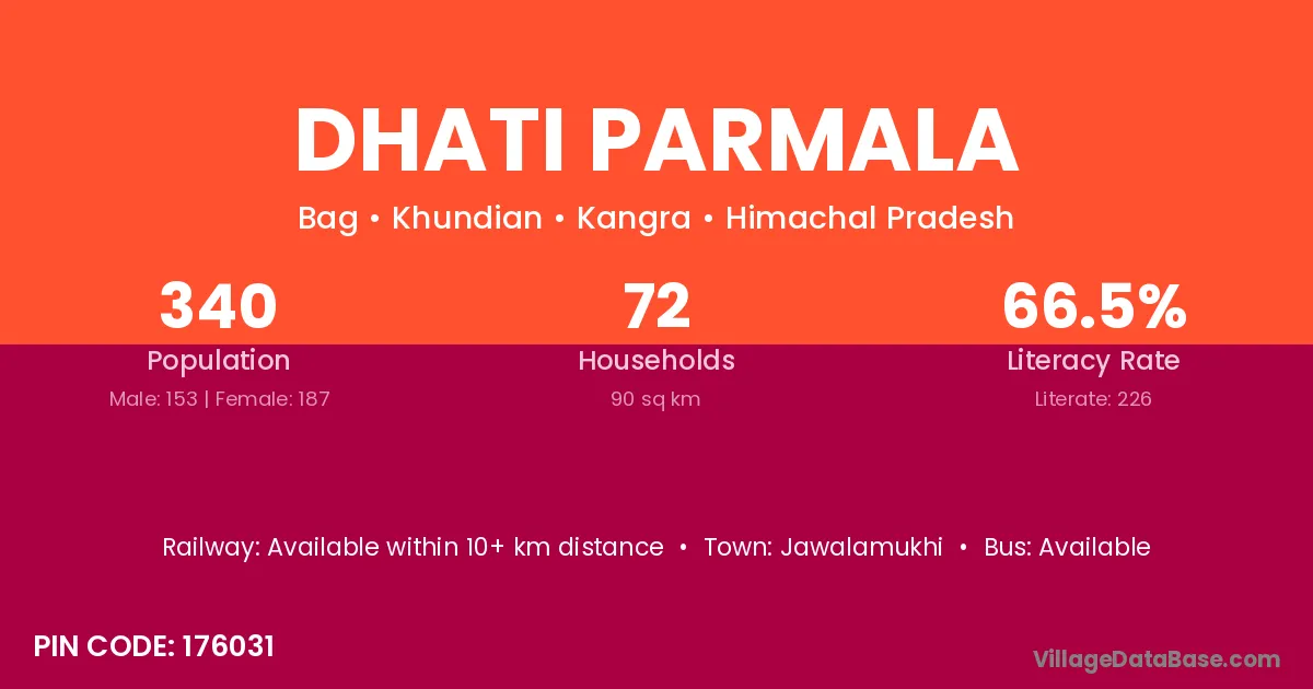 Jawalamukhi is the nearest town to Dhati Parmala village for major economic activities