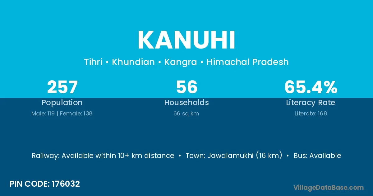 Jawalamukhi (16 km) is the nearest town to Kanuhi village for major economic activities and is located approximately 16 km away.