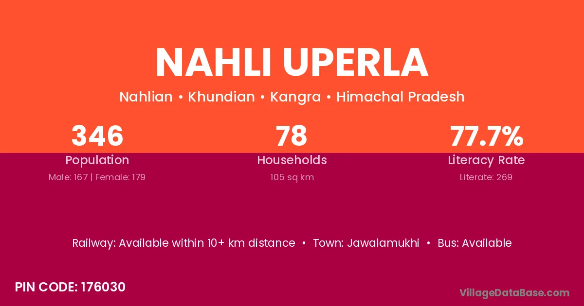 Jawalamukhi is the nearest town to Nahli Uperla village for major economic activities