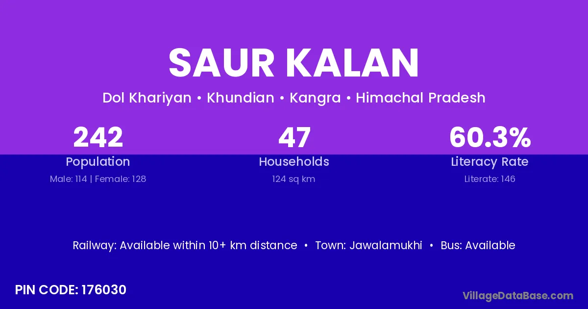 Jawalamukhi is the nearest town to Saur Kalan village for major economic activities
