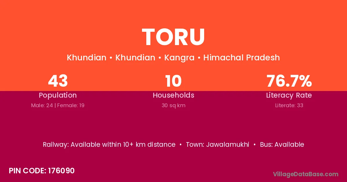 Toru village has a total population of 43 people, of which 24 are males and 19 are females.