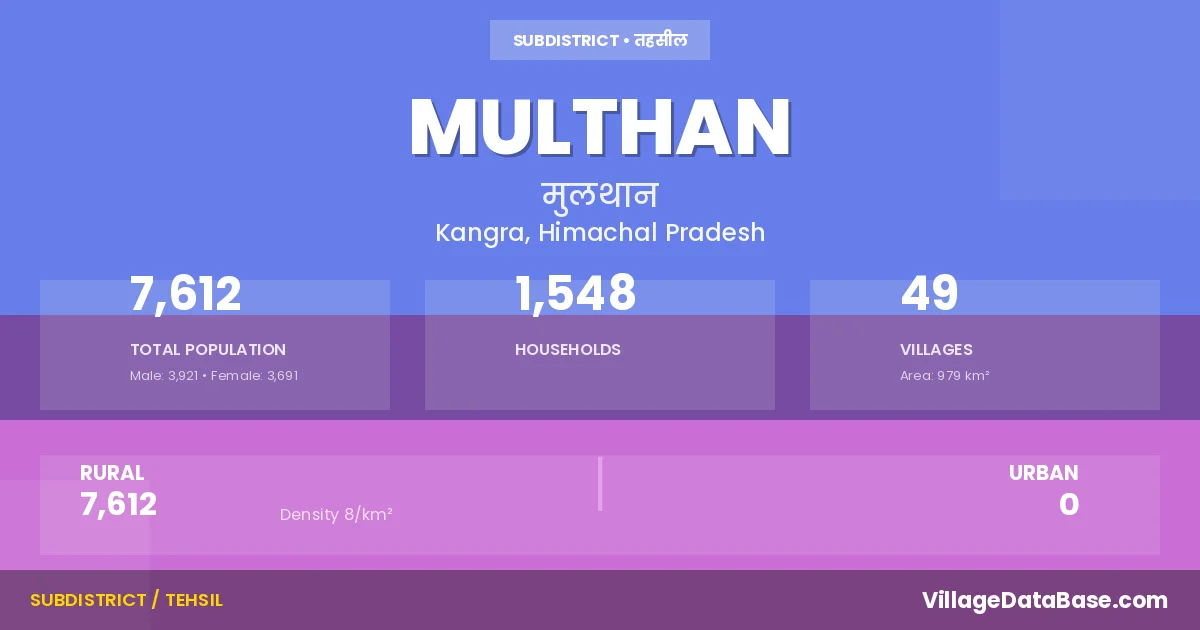 Multhan is a town and Tehsil in the Kangra district of the Himachal Pradesh. In India, a Tehsil is a subdivision of a district responsible for the administration and revenue collection of a specific area within the district. Tehsils play a crucial role in the local governance structure, contributing significantly to the development and administration of their communities.