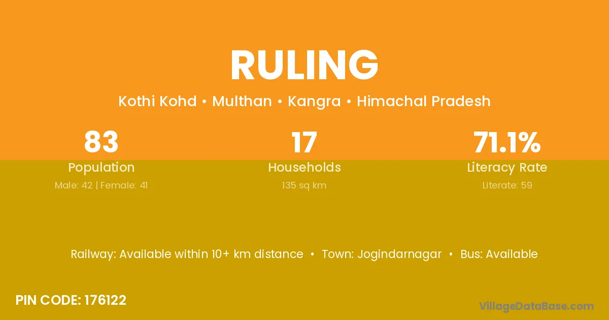 Ruling village has a total population of 83 people, of which 42 are males and 41 are females.
