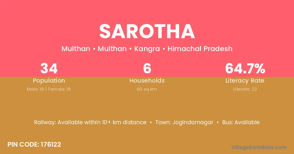 Sarotha village has a total population of 34 people, of which 18 are males and 16 are females.