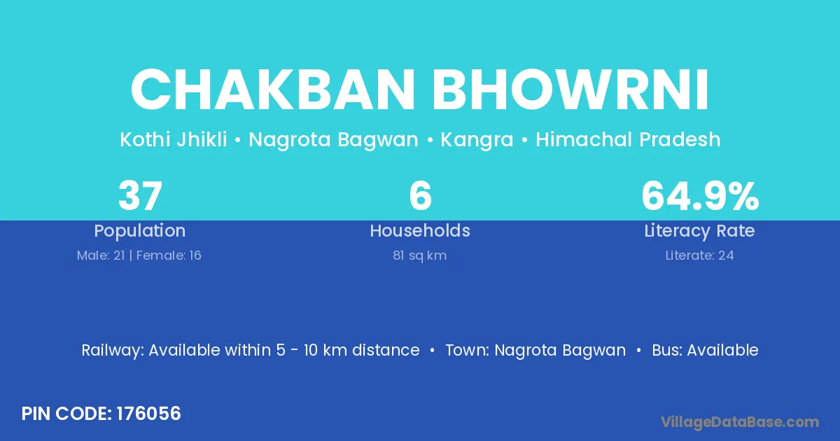Chakban Bhowrni village has a total population of 37 people, of which 21 are males and 16 are females.