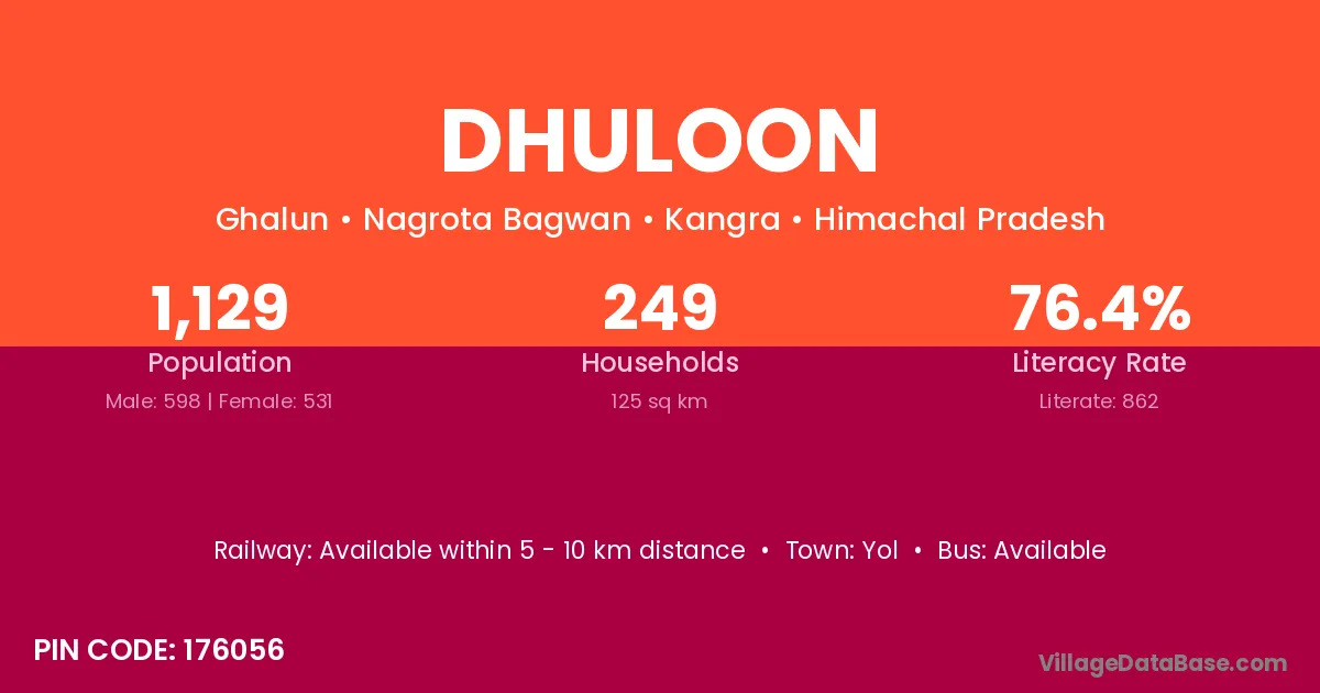 Dhuloon village has a total population of 1,129 people, of which 598 are males and 531 are females.
