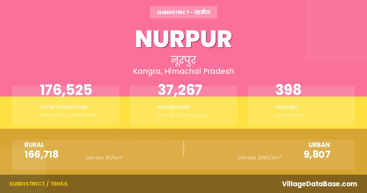 According to the 2011 census The total area of Nurpur Tehsil is 540 km², with a population of 176525 people. The population density is 327 inhabitants per square kilometre, and there are approximately 37267 houses in the sub district.
