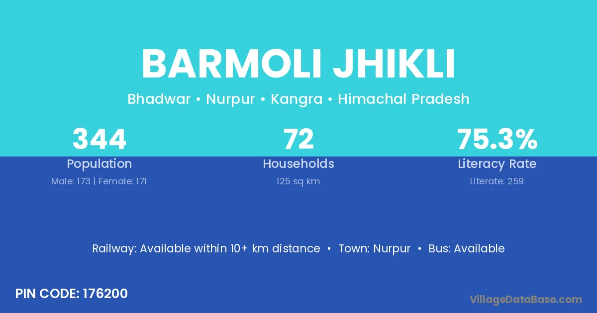 Barmoli Jhikli village has a total population of 344 people, of which 173 are males and 171 are females.
