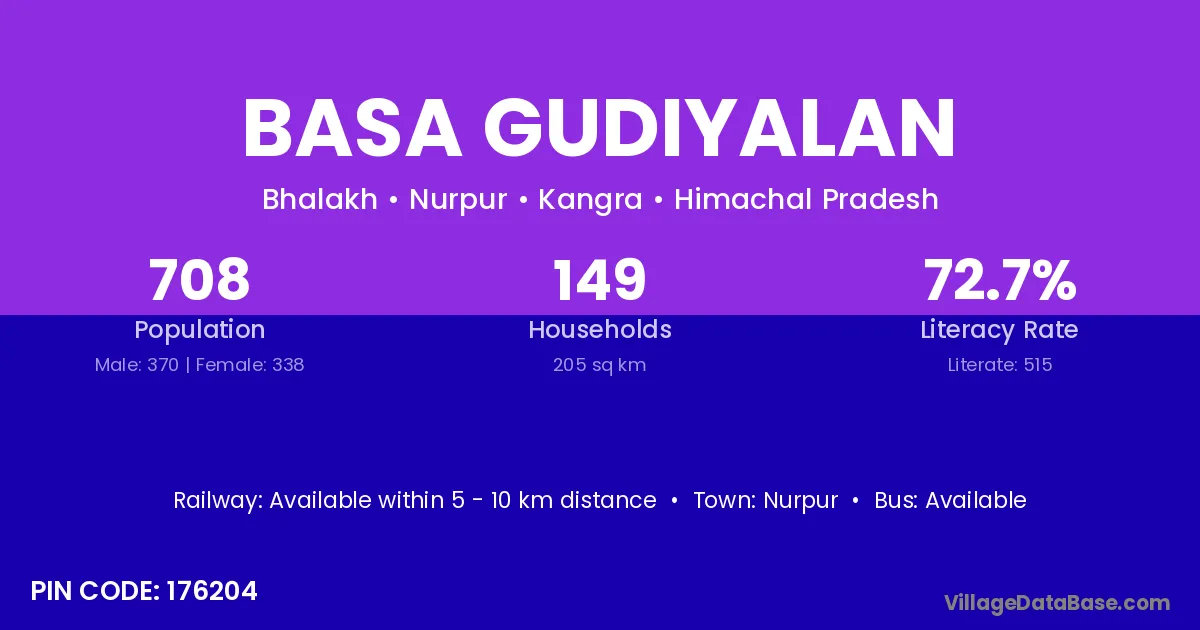 Basa Gudiyalan village has a total population of 708 people, of which 370 are males and 338 are females.
