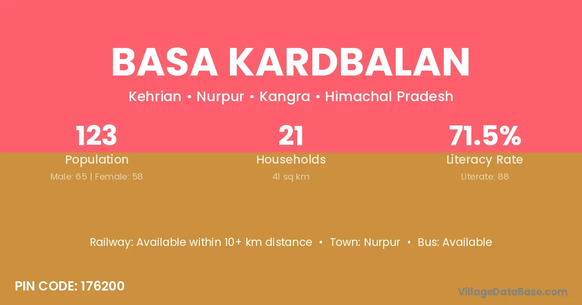 Basa Kardbalan village has a total population of 123 people, of which 65 are males and 58 are females.