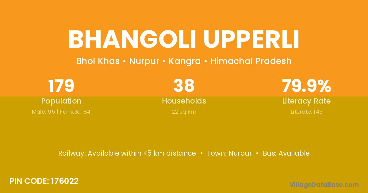 Bhangoli Upperli village has a total population of 179 people, of which 95 are males and 84 are females.