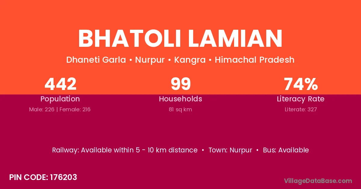 Bhatoli Lamian village has a total population of 442 people, of which 226 are males and 216 are females.