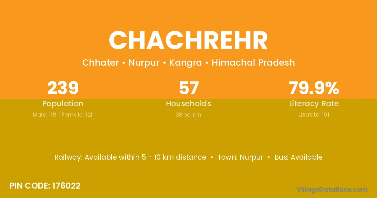 Chachrehr village has a total population of 239 people, of which 118 are males and 121 are females.