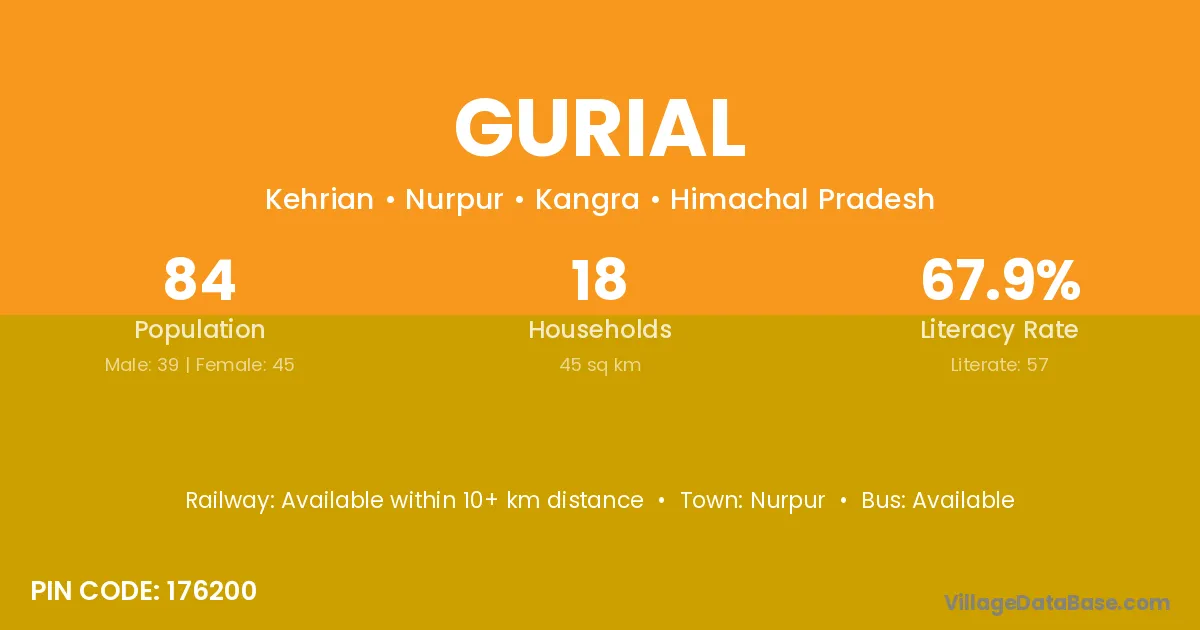 Gurial village has a total population of 84 people, of which 39 are males and 45 are females.