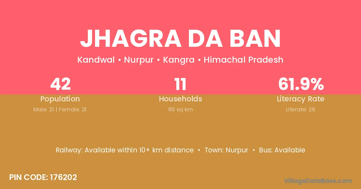 Jhagra Da Ban village has a total population of 42 people, of which 21 are males and 21 are females.