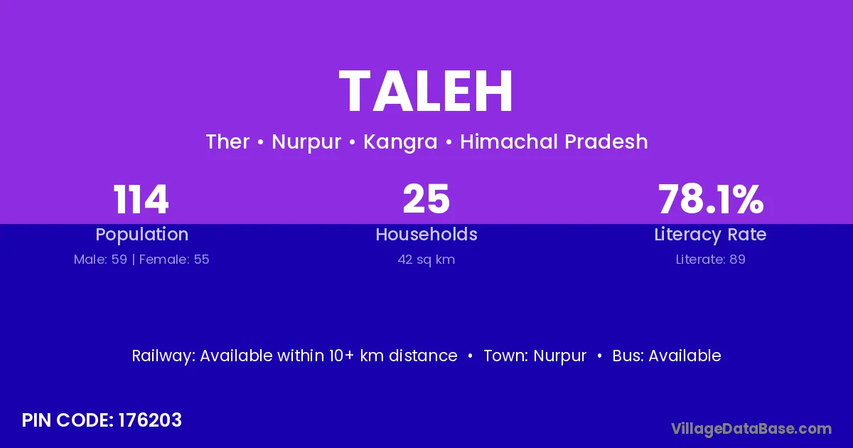 Taleh village has a total population of 114 people, of which 59 are males and 55 are females.