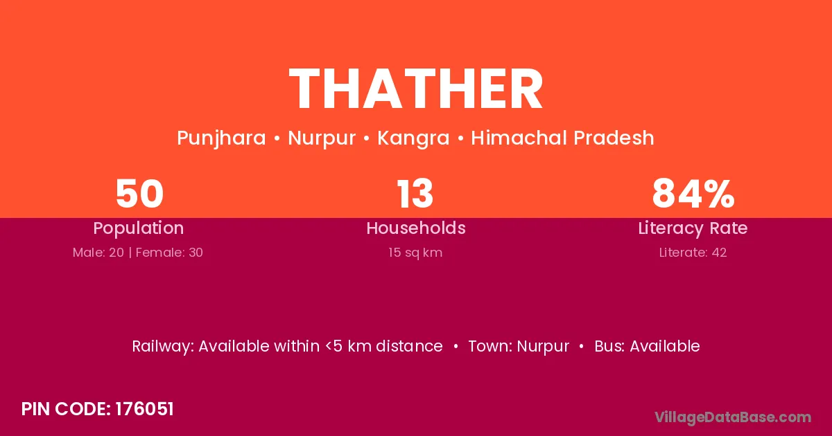 The literacy rate of Thather village is 84.00%. Male literacy stands at 95.00% and female literacy at 76.67%.