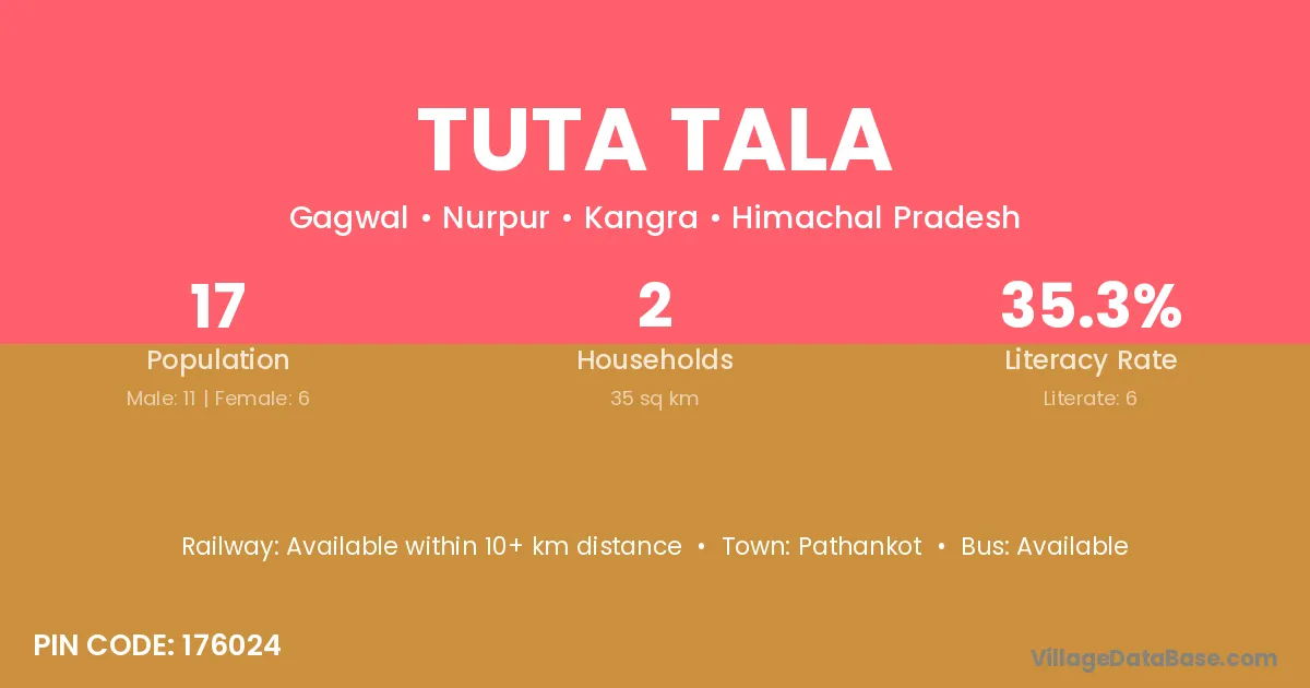 Tuta Tala village has a total population of 17 people, of which 11 are males and 6 are females.
