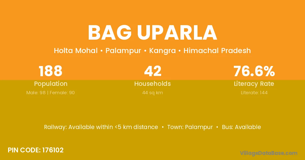 Palampur is the nearest town to Bag Uparla village for major economic activities