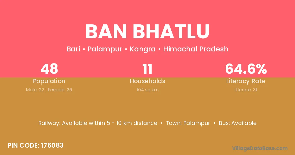 Palampur is the nearest town to Ban Bhatlu village for major economic activities