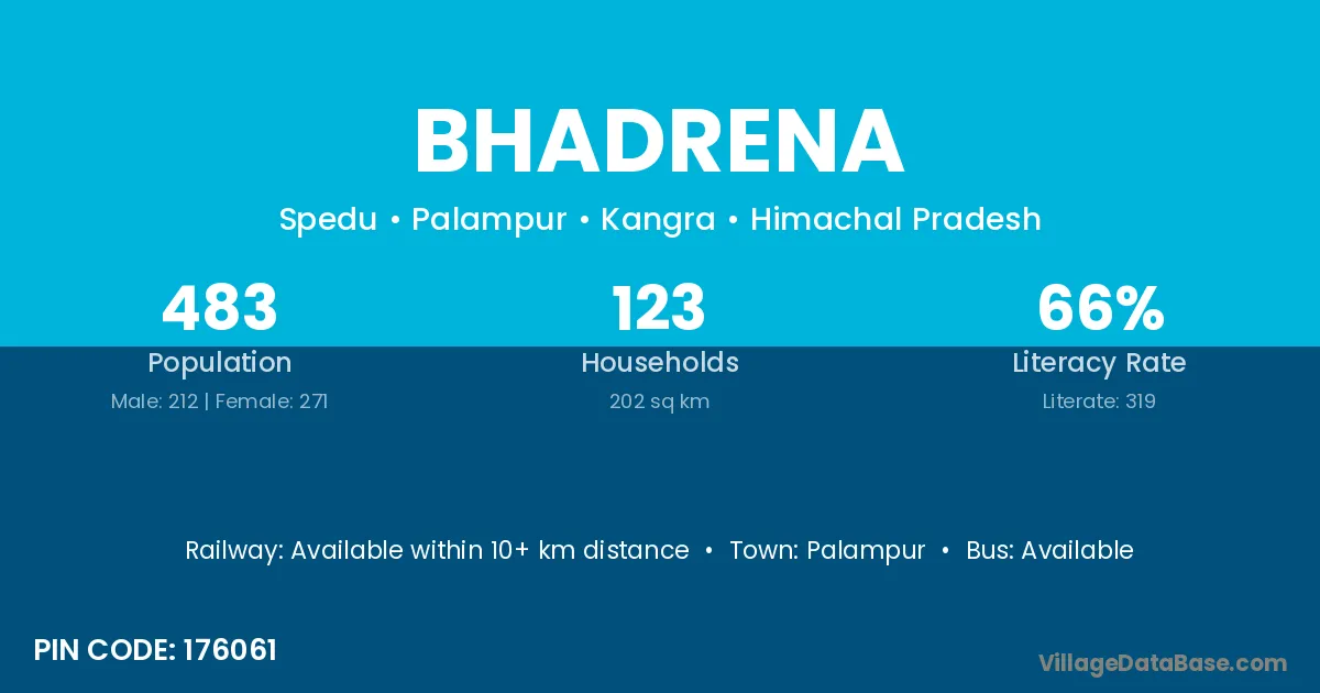 Palampur is the nearest town to Bhadrena village for major economic activities