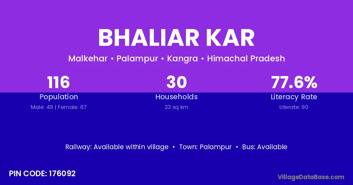 Bhaliar Kar village has a total population of 116 people, of which 49 are males and 67 are females.