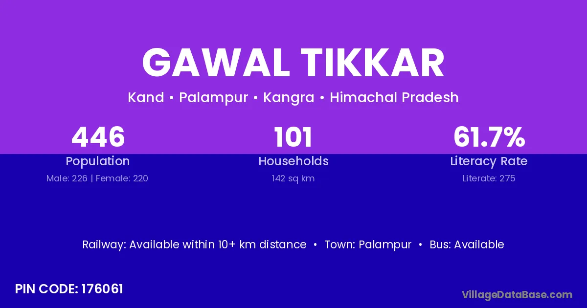 Palampur is the nearest town to Gawal Tikkar village for major economic activities