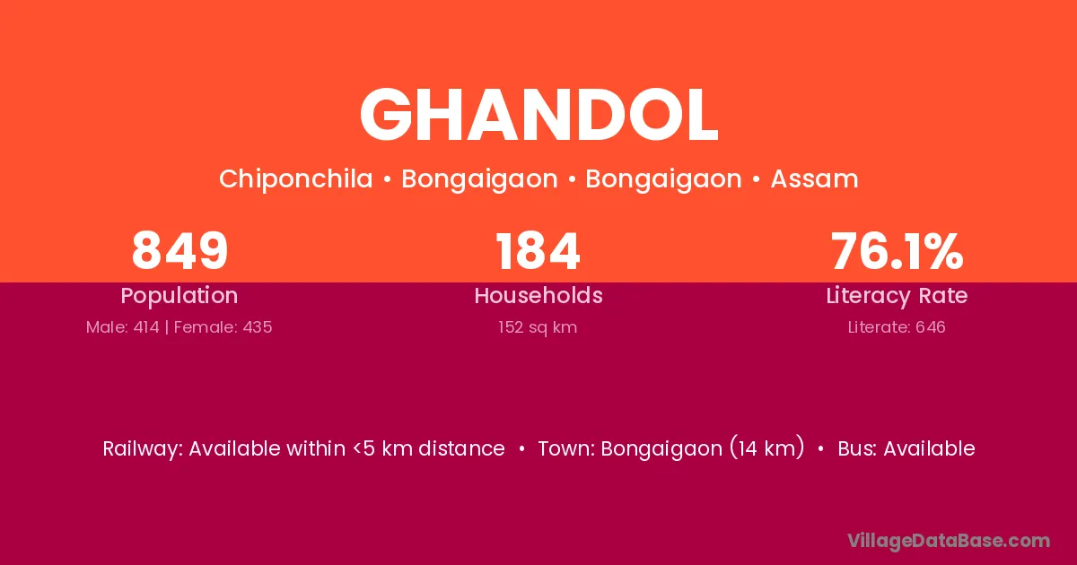The literacy rate of Ghandol village is 79.45%. Male literacy stands at 88.89% and female literacy at 70.27%.