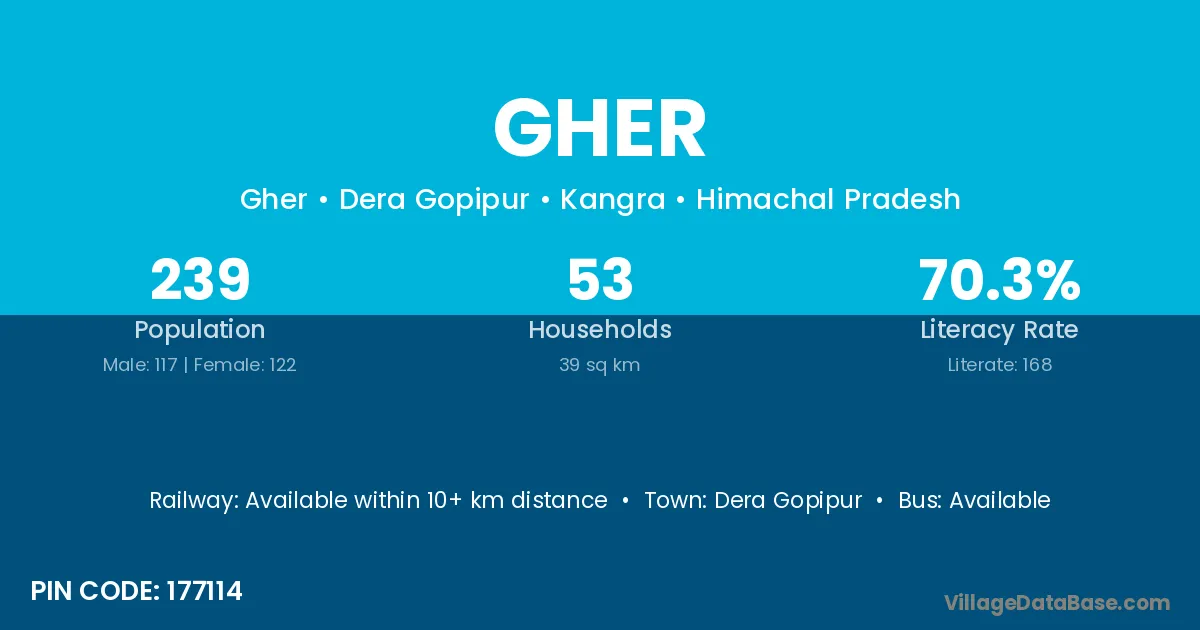 The literacy rate of Gher village is 75.00%. Male literacy stands at 83.98% and female literacy at 66.51%.