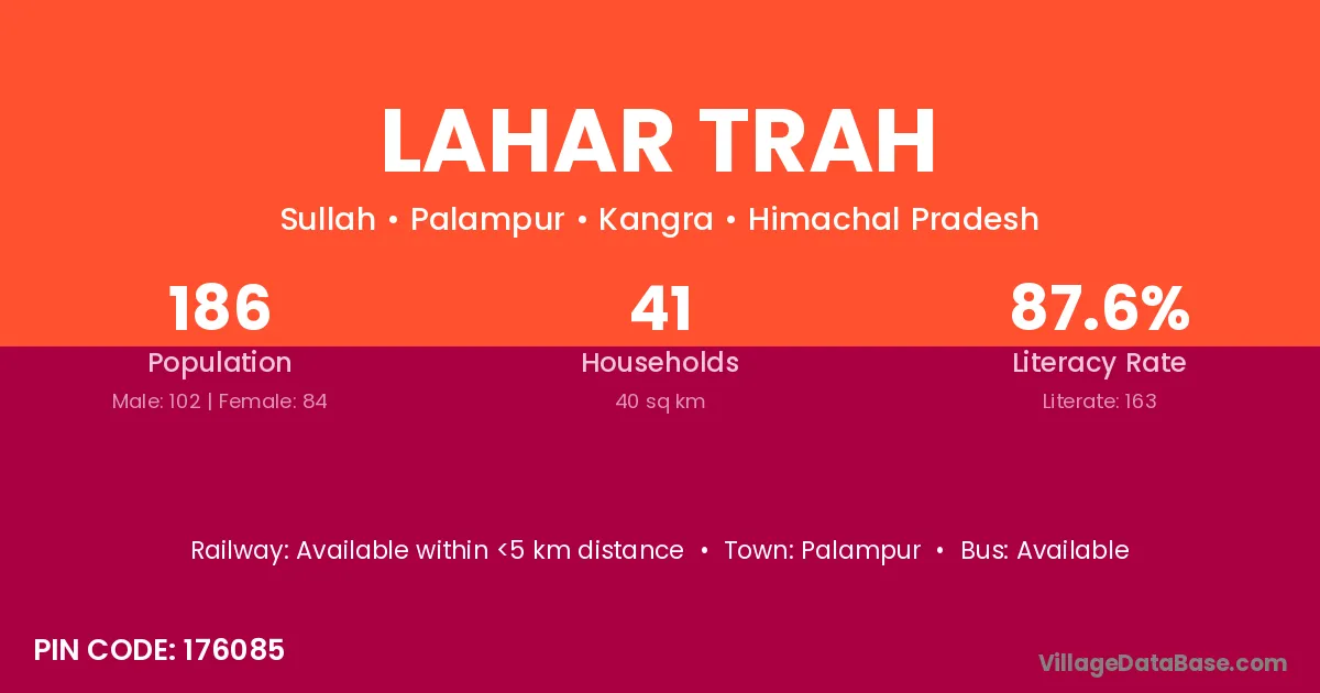 Palampur is the nearest town to Lahar Trah village for major economic activities