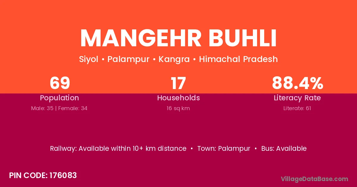 Palampur is the nearest town to Mangehr Buhli village for major economic activities