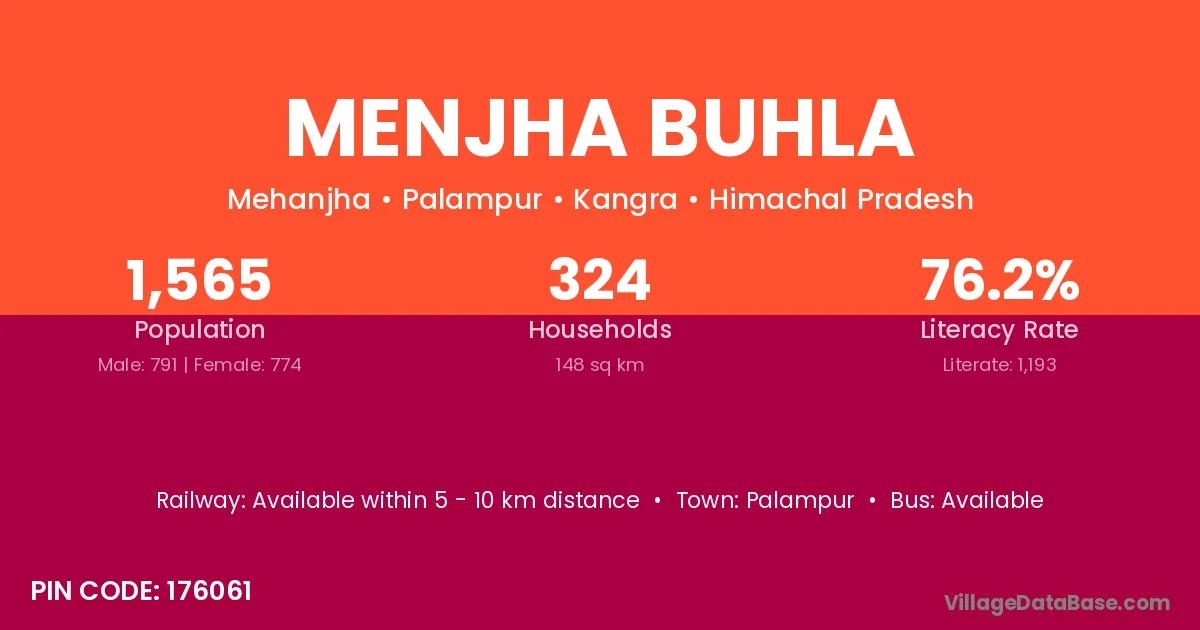 Palampur is the nearest town to Menjha Buhla village for major economic activities